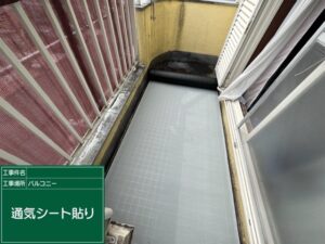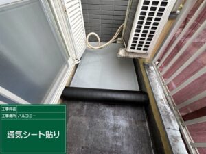 下地に残る湿気を逃がすため、通気シートを施工します。防水層の膨れを防ぐ通気緩衝工法の要となる工程です。