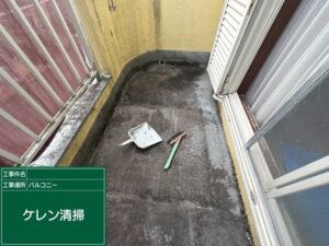 ベランダ床には黒ずみやカビが広がり、防水層の劣化が進んでいる状態でした。
