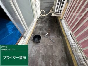 下地と防水材の密着を高めるため、専用プライマーを塗布します。これにより、防水層の剥がれを防ぎます。