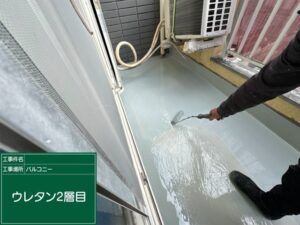 さらに重ね塗りを行い、厚みのある防水層を作ります。耐久性と防水性を高める重要な工程です。