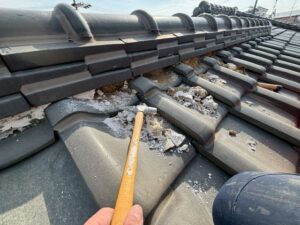 屋根を点検したところ、棟部分の漆喰が厚く塗られすぎており、内部に雨水が入り込みやすい構造になっていました。