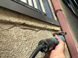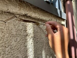 外壁は大変細いヘアクラックでしたので、奥のひびにもシリコン材が届くように、最初にV字でクラック部分を囲むようにカットしてから施工しています。