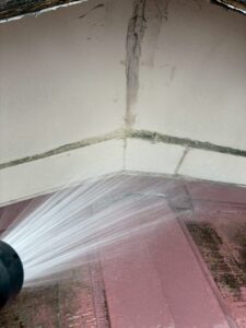 屋根と壁の取り合い部になりますが、こちらも散水検査をおこなったところ雨漏りしていることが判明しました。