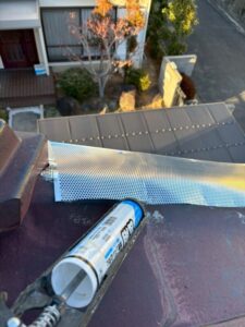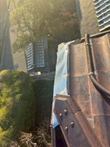 葉っぱを除去し、詰まりを解消してから、棟板金に代わりパンチメタルで雨樋を塞ぎます。