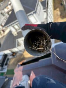 雨樋、丸樋の中の葉っぱを取り除き、詰まりを解消しました。