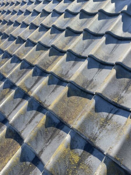 湿気を好むコケやカビが繁殖し、瓦全体が黒ずんだり緑色に変色したりします。
